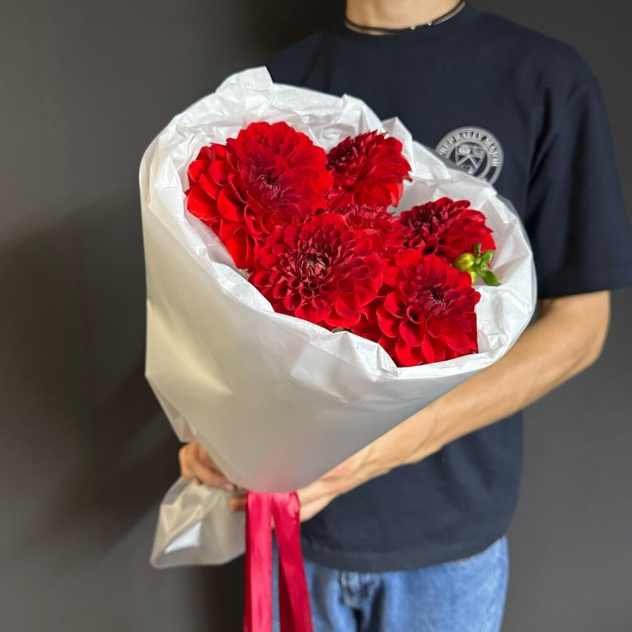 На фото букет из 7 красных георгин. В составе: георгина 7 шт, дизайнерская упаковка 2 шт, атласная лента 1 шт, . Все цветы свежие и ароматные, букет красиво оформлен и отлично подходит для подарка. Доступна доставка цветов или самовывоз.