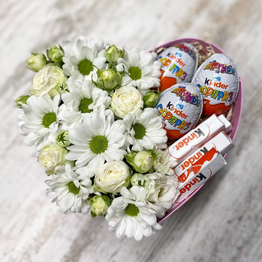 На фото композиция с цветами и киндерами в коробке. В составе: хризантема кустовая 2 шт, кустовая роза 1 шт, киндер-сюрприз 3 шт, киндер шоколад 1 шт, коробка (s) 1 шт, . Все цветы свежие и ароматные, букет красиво оформлен и отлично подходит для подарка. Доступна доставка цветов или самовывоз.