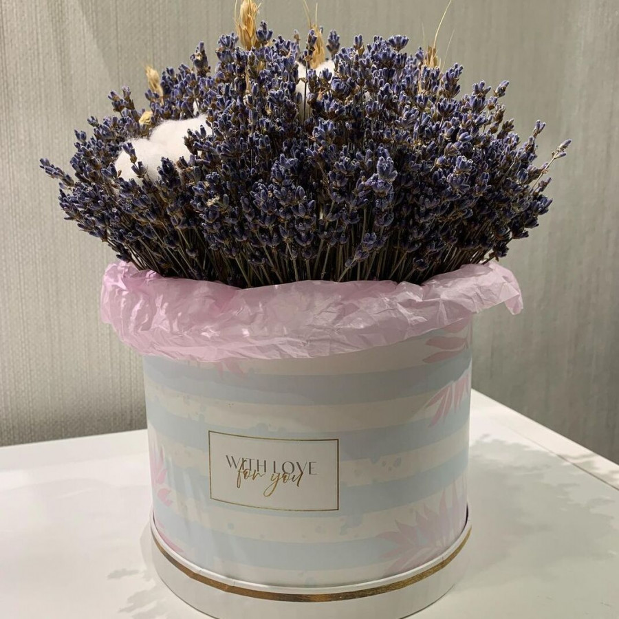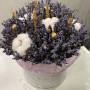 На фото шляпная коробка с лавандой. В составе: лаванда 14 шт, хлопок 5 шт, крафт-бумага 1 шт, шляпная коробка (m) 1 шт, . Все цветы свежие и ароматные, букет красиво оформлен и отлично подходит для подарка. Доступна доставка цветов или самовывоз.